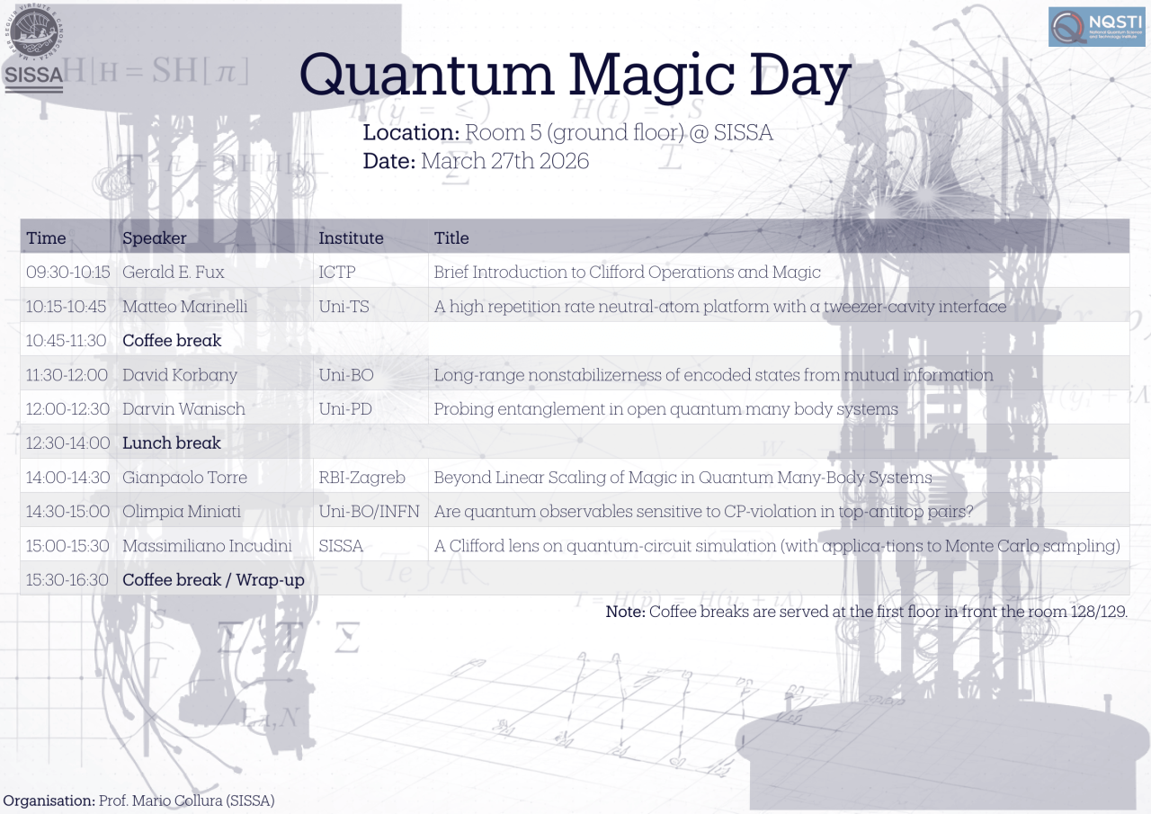 We are pleased to advertise Quantum Magic Day @ SISSA, which will take place on Friday 27th March 2026, in Room 5 (SISSA ground floor), from 9:30 to 16:30.